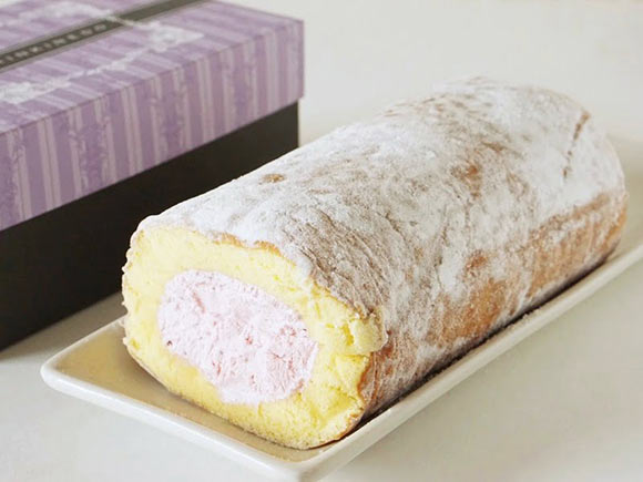 新杵堂のストロベリースターロールは、苺の果肉入りのクリームを巻き上げたロールケーキ。