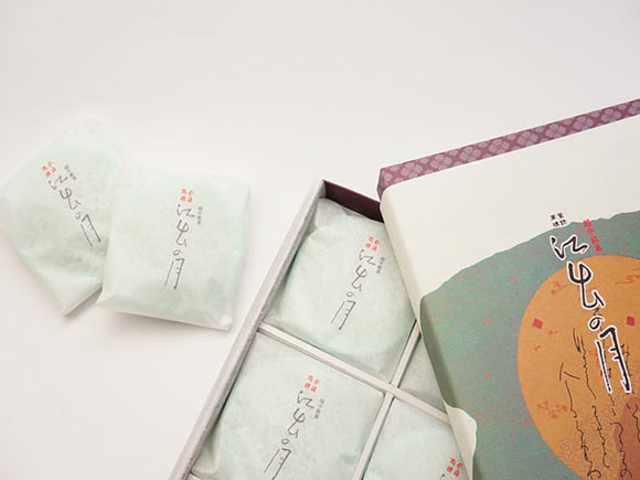 江出の月は、おぼろ種に自家製の白味噌餡を薄くはさんだお菓子。