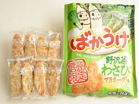 今回ご紹介する信州限定ばかうけは、野沢菜わさびマヨネーズ味。