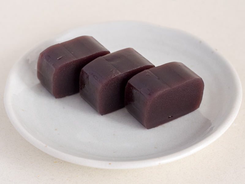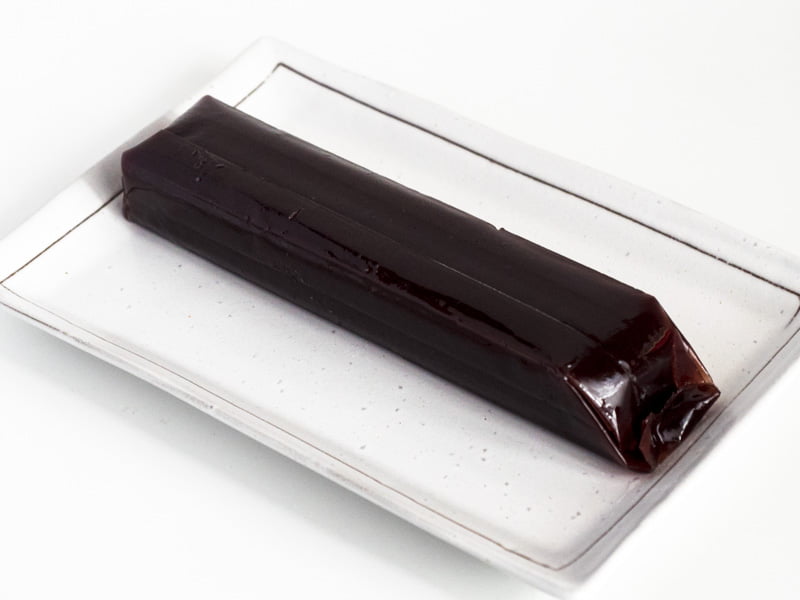 一本を切り分けて食べますが、断面はマットな感じです。見た目は、一般的な羊羹と区別がつかないですね。