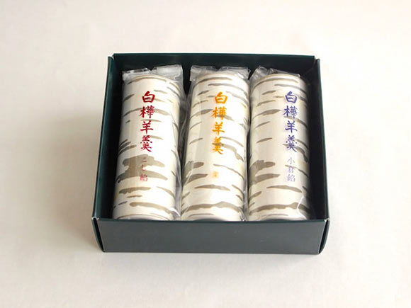 その名前にも入っているように、白い模様が美しい白樺の木をモチーフにしたデザインの細長い容器に3種類の味の羊羹が入っています。
