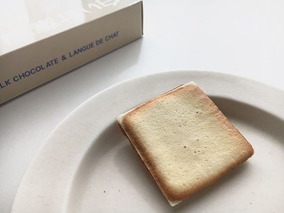 よくあるラングドシャとは比べ物にならないほどの、しっかりと厚みのある板チョコが挟まれていて、かなり食べごたえがあります。
