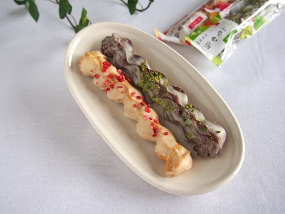 生地はプレーンとココアの2種類で、どちらもホワイトチョコレートでコーティングされています。