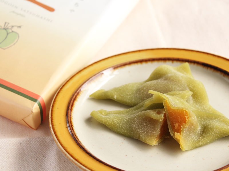 かぼちゃの皮を表現した緑色の生八ッ橋は抹茶。
