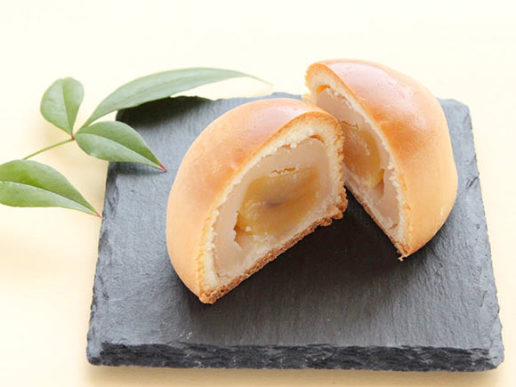栗がまるごと一粒包み込まれている栗まんじゅう。存在感たっぷりの大粒のおまんじゅうです。