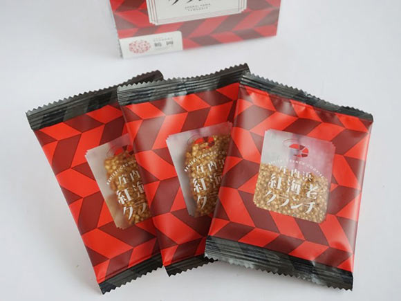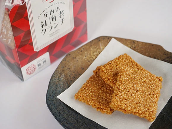 庄内特産の紅エビと藻塩を使い、ざくざくのクランチ状に焼き上げたもの。おこげを思わせる見た目と香ばしい海老の風味は、おやつはもちろんおつまみにもぴったりです。