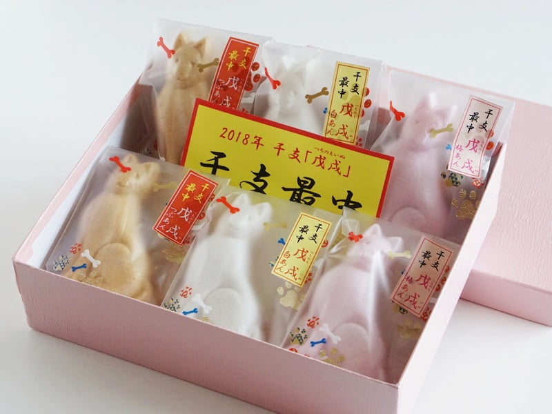 2018年は戊戌(つちのえ・いぬ)のため、犬をモチーフにした最中種に3種類のあんを包んであります。