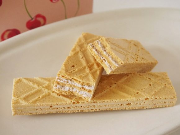 山形さくらんぼーどは、薄焼きのクッキー生地でチョコレートをはさんだ、5層構造のチョコウェハースクッキー。