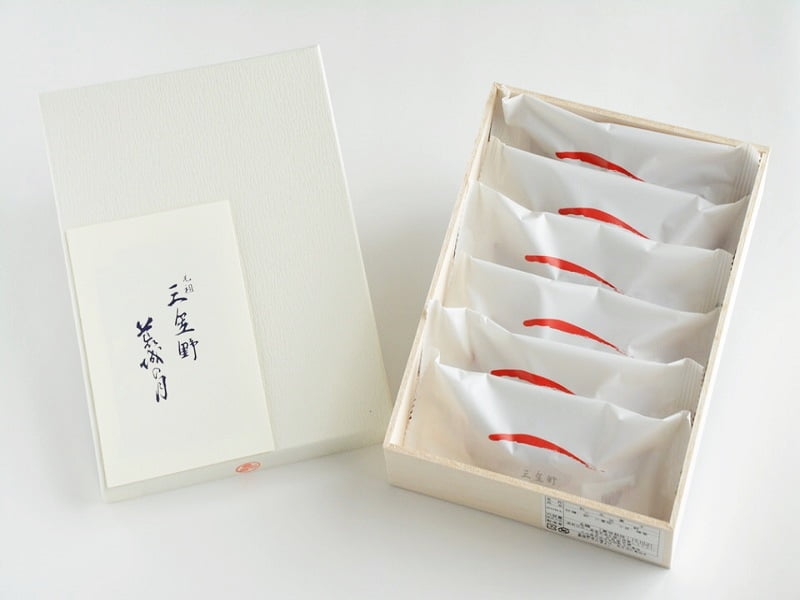 但馬屋老舗の三笠野は個包装タイプと、箱にそのまま入っているタイプの2種類。個包装タイプには写真の6個入のほかに、8個入、16個入、24個入があります。