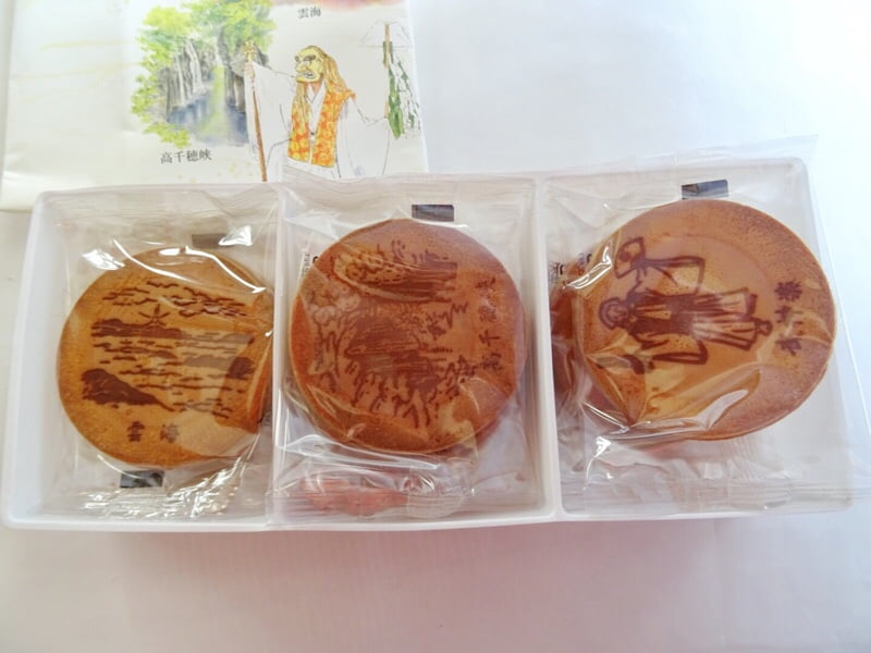 「高千穂玉子せんべい」には、高千穂を代表する景色である高千穂峡に夜神楽、そして雲海の風景の3種類がせんべいに描かれています。