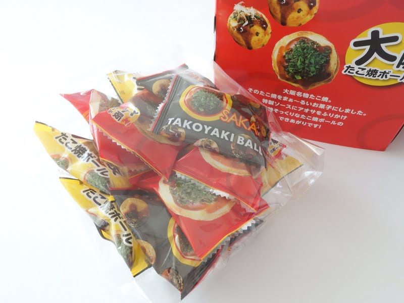 このお菓子は、パッケージにたこ焼き器がデザインされていますよ。
