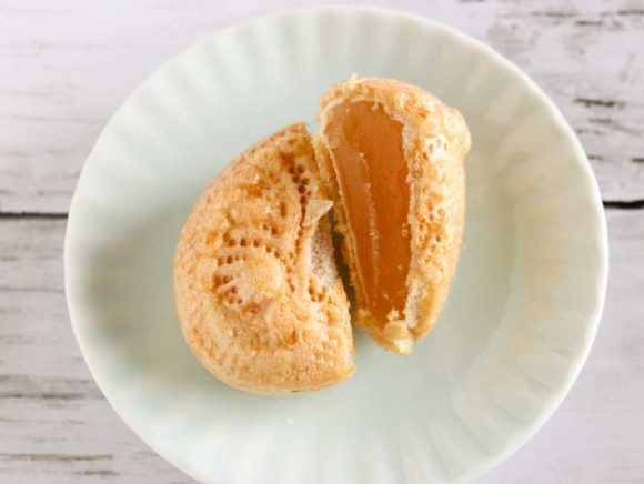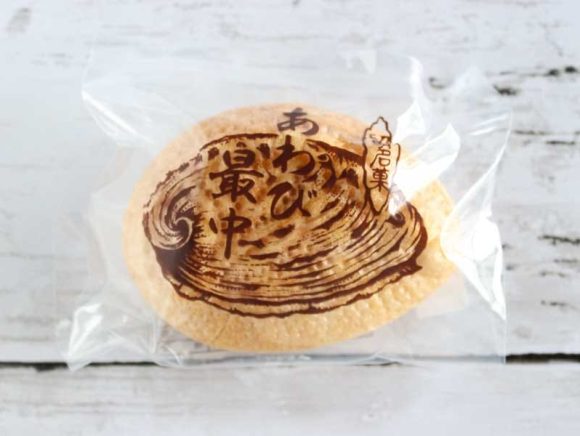 あわび最中は北海道留萌近海でとれるあわびを形どったお菓子で、手亡豆の白あんにゴマとレーズンが入っていますよ。
