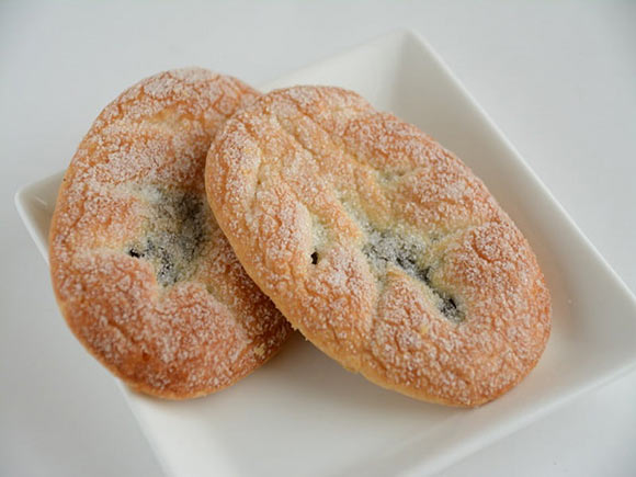 砂糖がまぶされた生地の中に、黒豆入りのあんが入っていますよ。