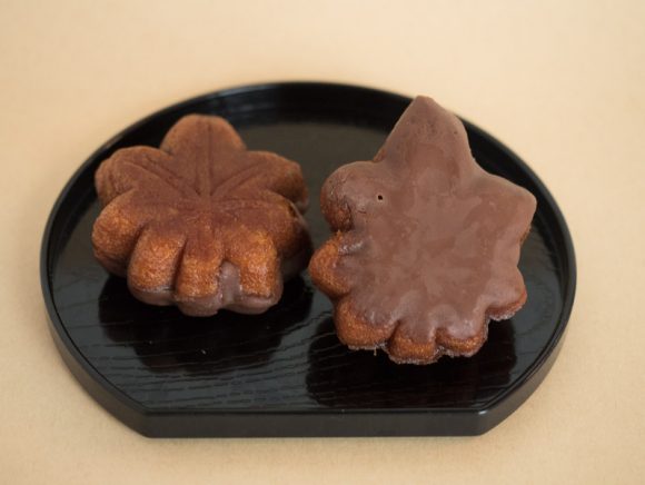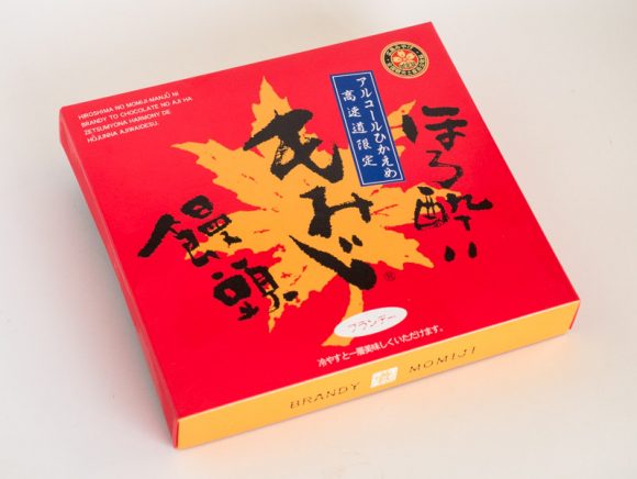 もみじ饅頭の片面をミルクチョコレートでコーティングした上、ブランデー入りのシロップにつけ込んだもの。