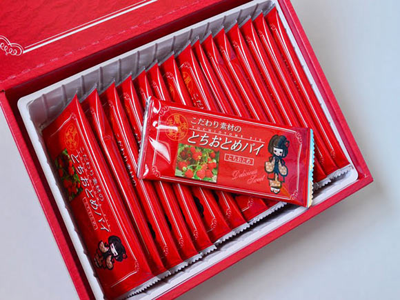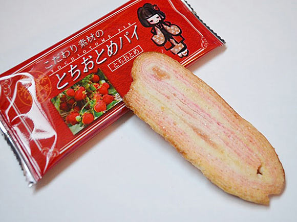 真っ赤なパッケージが目を惹く「とちおとめパイ」。ほんのり苺風味のパイ菓子です。