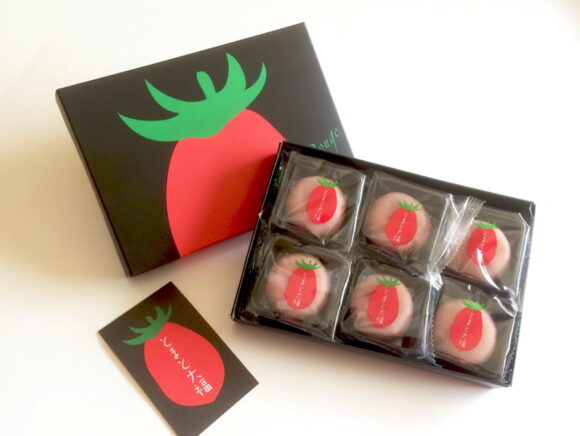 名産品のひとつであるトマトを、薄ピンク色の小粒な大福に仕立てたのがこちらのおみやげ。