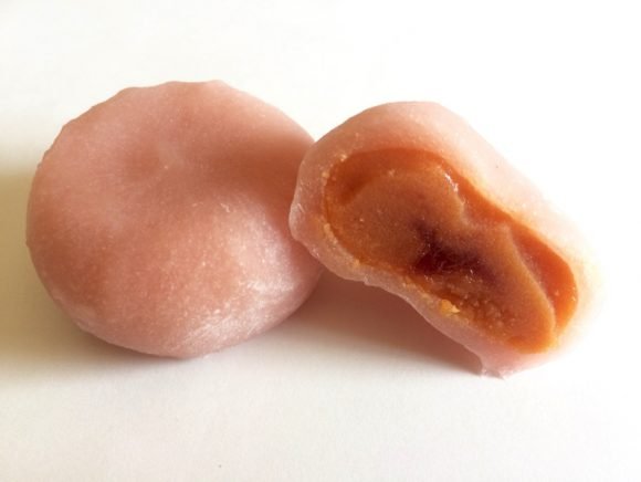中心に入っているトマトジャムを餡で包み、さらにピンク色の大福餅で包んであるという三層構造です。