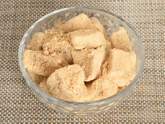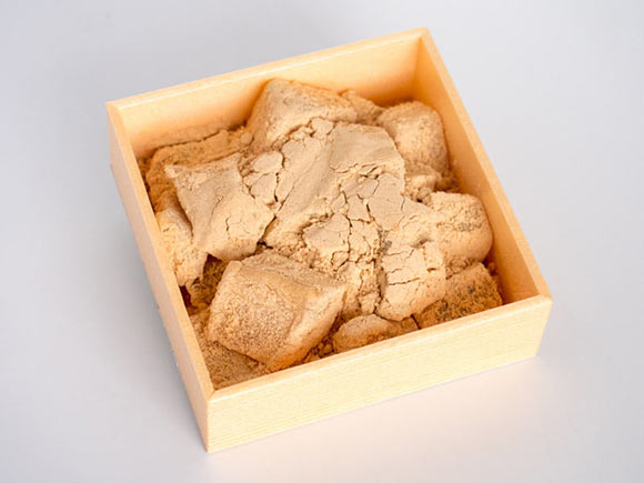 虎屋のわらび餅はパックの中に入っていて、きな粉がたっぷりとまぶしてあります。