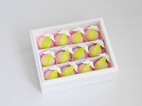 外箱を開けると、桃のイラストが描かれた袋が並びます。