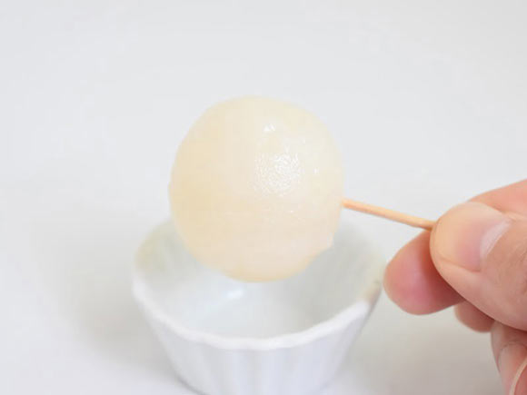 爪楊枝に刺したまま一口でパクッ。口いっぱいに冷たさが伝わります。