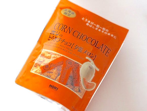 オレンジ色のお洒落なデザインも印象的な「とうきびチョコ【夕張メロン】」は、封を開けるとほのかに夕張メロンの香りが。