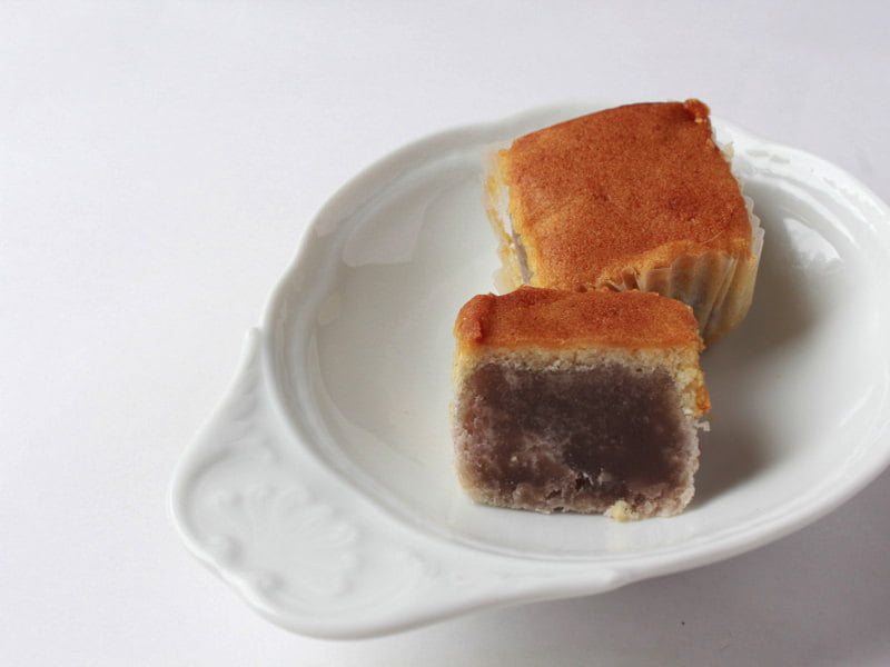 まわりは洋風のケーキ生地で、中は小豆あんと白あんを合わせたこしあん。