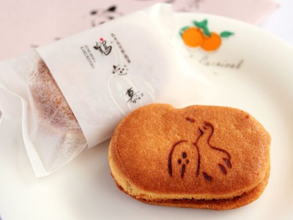 鶴恋慕は小判型をしたビスケット。表面には出水のシンボルともいれる鶴のマークが浮き上がっています。