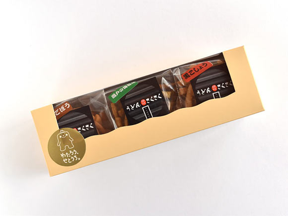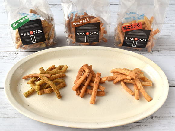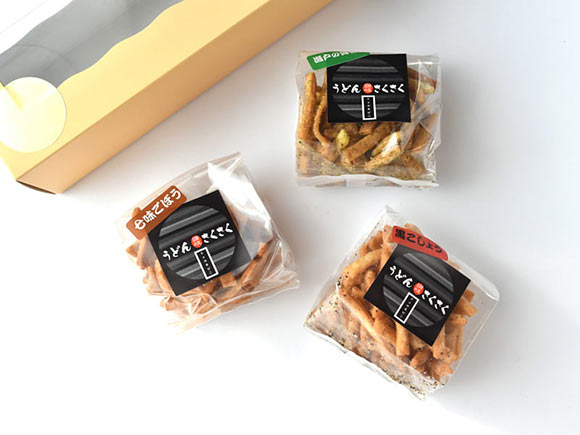 数種類あるフレーバーの中から「黒こしょう」「瀬戸の海苔塩」「七味ごぼう」の3種類をセットにしたものが「うどんさくさく箱セット」。