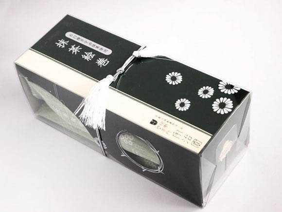 今回紹介する「抹茶絵巻」は、石臼挽き宇治抹茶を使用したクリームロール。