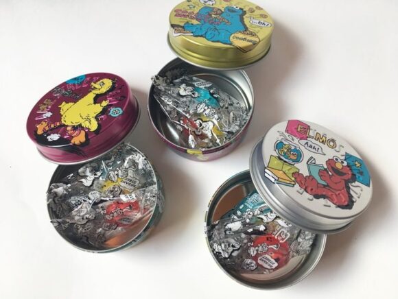 エルモ、クッキーモンスター、ビッグバードが描かれた缶の中には、個別包装された3種類のキャンディが入っています。