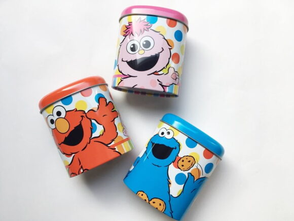 カラフルで賑やかなデザインの箱の中には、エルモ、モッピー、クッキーモンスターの3つの缶が入っています。