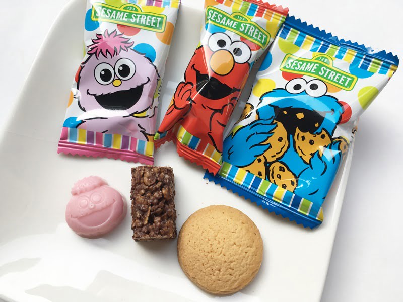 エルモの缶にはミルククランチ、モッピーの缶にはストロベリー風味チョコ、クッキーモンスターの缶の中にはプレーンクッキーが10個ずつ入っていました。
