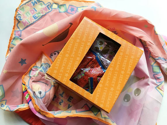 クランチチョコ入りの箱が、エルモとモッピーが描かれた大判のハンカチで包まれています。
