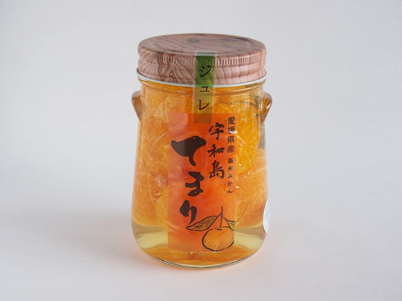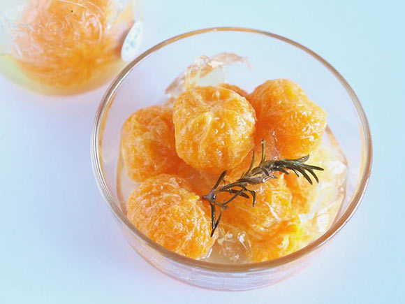 宇和島てまりは、丁寧に皮を剥かれた手のひらサイズの温州みかんに、ローズマリーの香りがするジュレをまとわせました。
