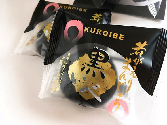 「一口食べると3日若返る」をキャッチコピーに、竹炭と黒ごまを使用した真っ黒なまんじゅうです。