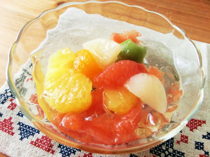中には、甘夏、ピンクグレープフルーツ、白桃、みかん、若桃、パイナップルが入っています。