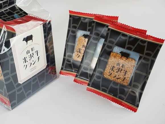 山形特産の米沢牛を使い、ざくざくのクランチ状に焼き上げたもの。香ばしい肉の風味たっぷりでついつい手がとまらなくなる、スナック系のおやつとなっています。