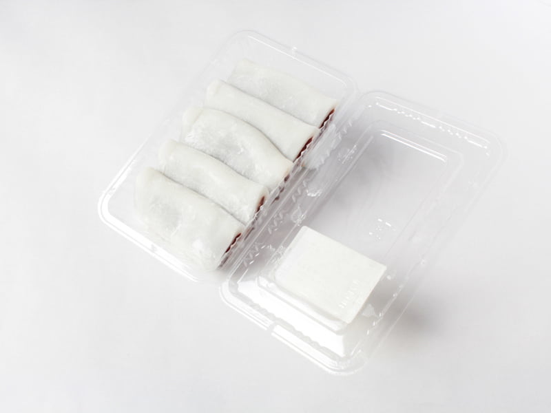 米の粉を蒸して作った団子を、長方形に薄く伸ばし、上に棒状に丸めたこし餡を“2本丸めて包みます。