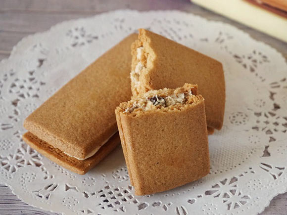 国産大麦100%のサブレ生地で、国産アカシアはちみつとレーズン入りのクリームをはさんでいます。