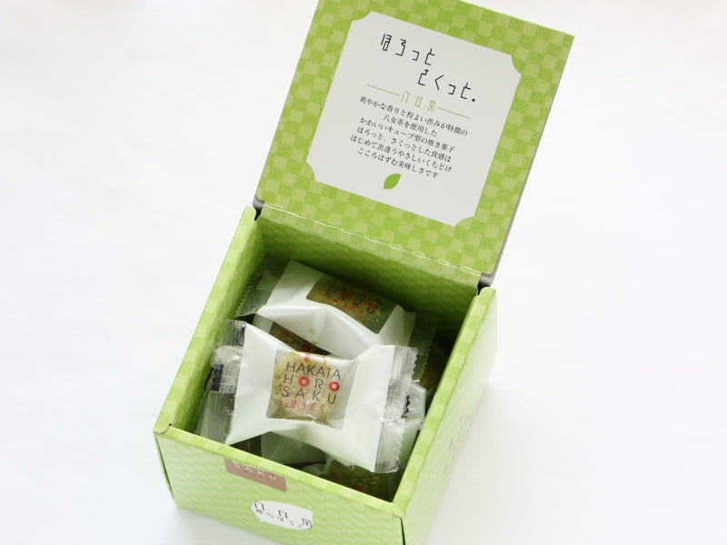 博多ほろさく(八女茶)はかわいいキューブ型をしたお菓子で、八女茶のほどよい渋みが効いています。