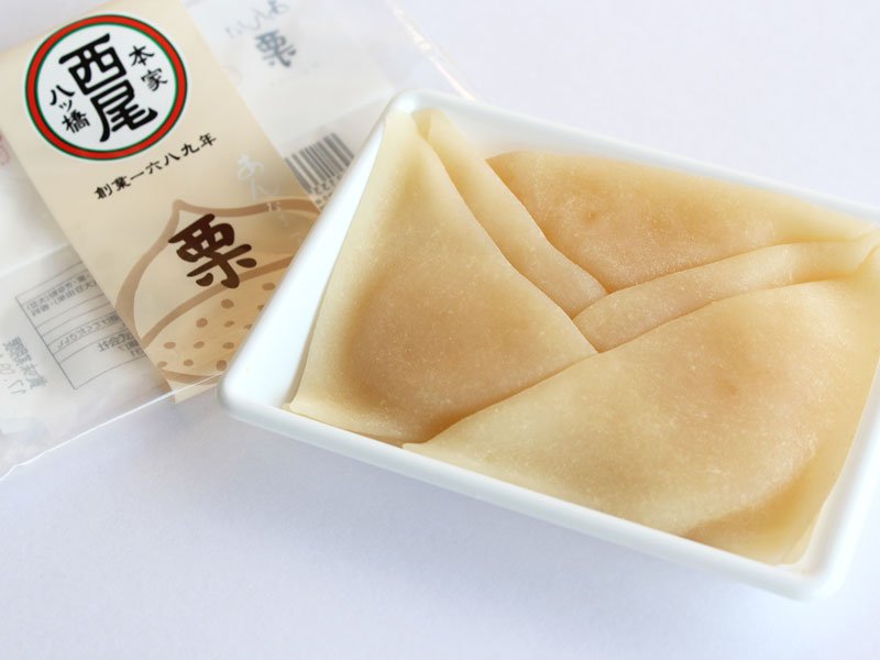 やわらかでもっちりとした生八ッ橋の皮に包まれているのは、栗の餡。