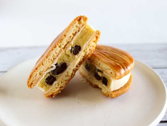 アーモンド風味のさつまいもペーストにレーズンを入れ、ホワイトチョコでコーティングしサブレでサンドしてあります。